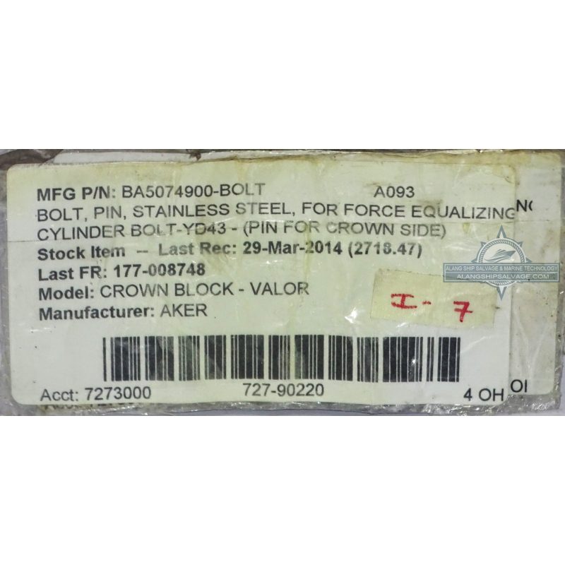 PRODUCT NAME : AKER,BOLT, PIN, STAINLESS STEEL, FOR FORCE EQUALIZING CYLINDER BOLT-YD43-(PIN FOR CROWN SIDE),CROWN BLOCK – VALOR (PN.BA5074900-BOLT)