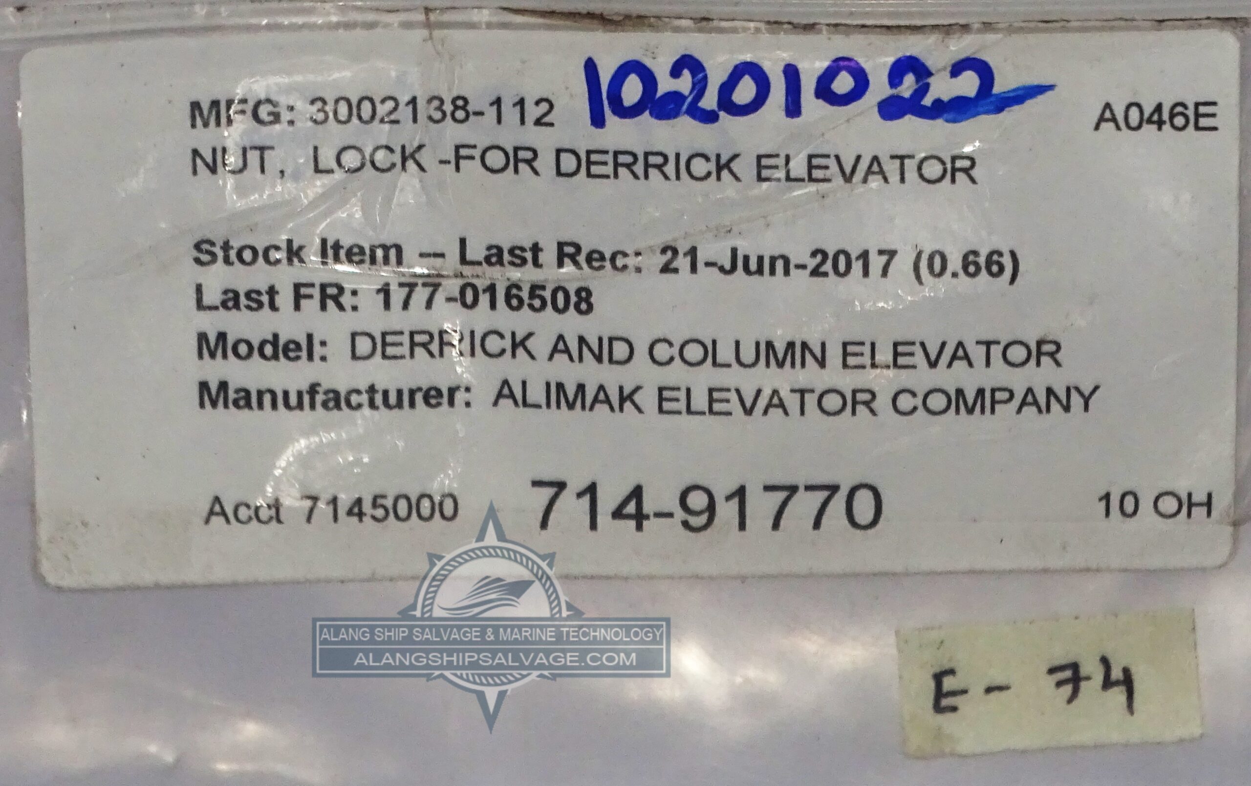 PRODUCT NAME : ALIMAK ELEVATOR COMPANY, NUT, LOCK-FOR DERRICK ELEVATOR, DERRICK AND COLUMN ELEVATOR (PN.3002138-112)