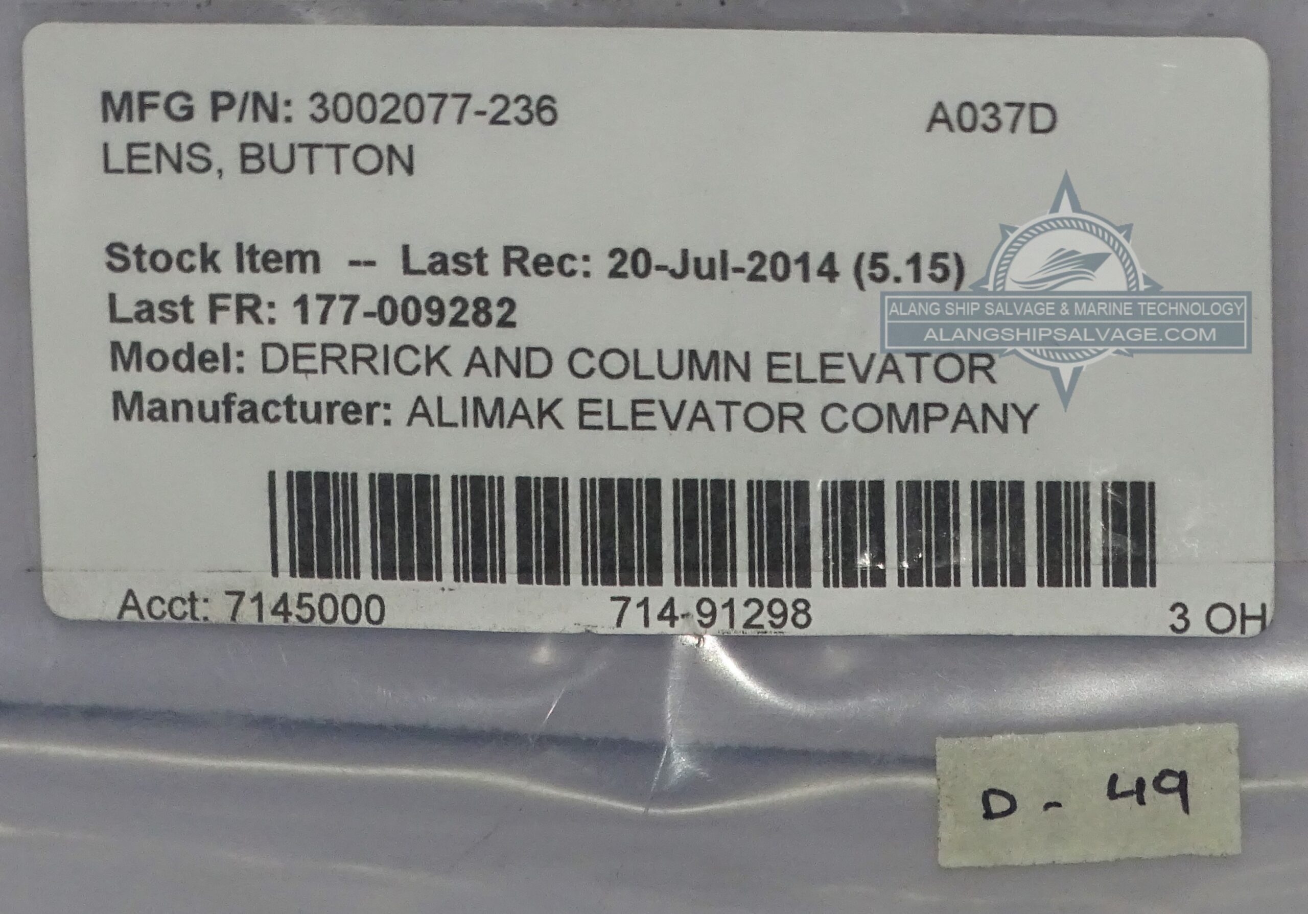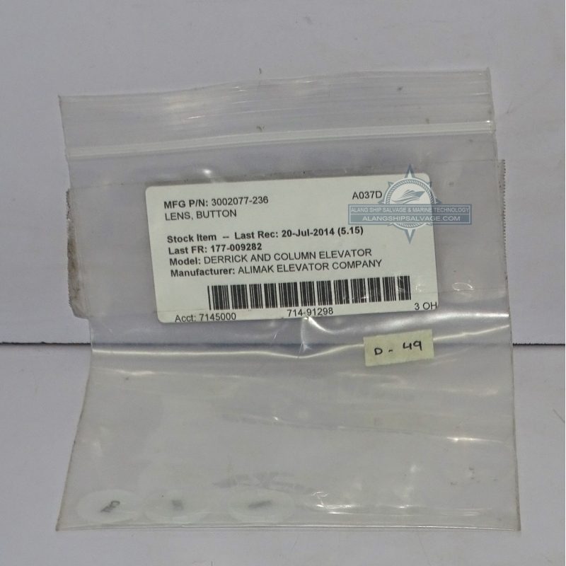 PRODUCT NAME : DERRICK AND COLUMN ELEVATOR (PN.3002077-236)LENS, BUTTON,MANUFACTURER.ALIMAK ELEVATOR COMPANY
